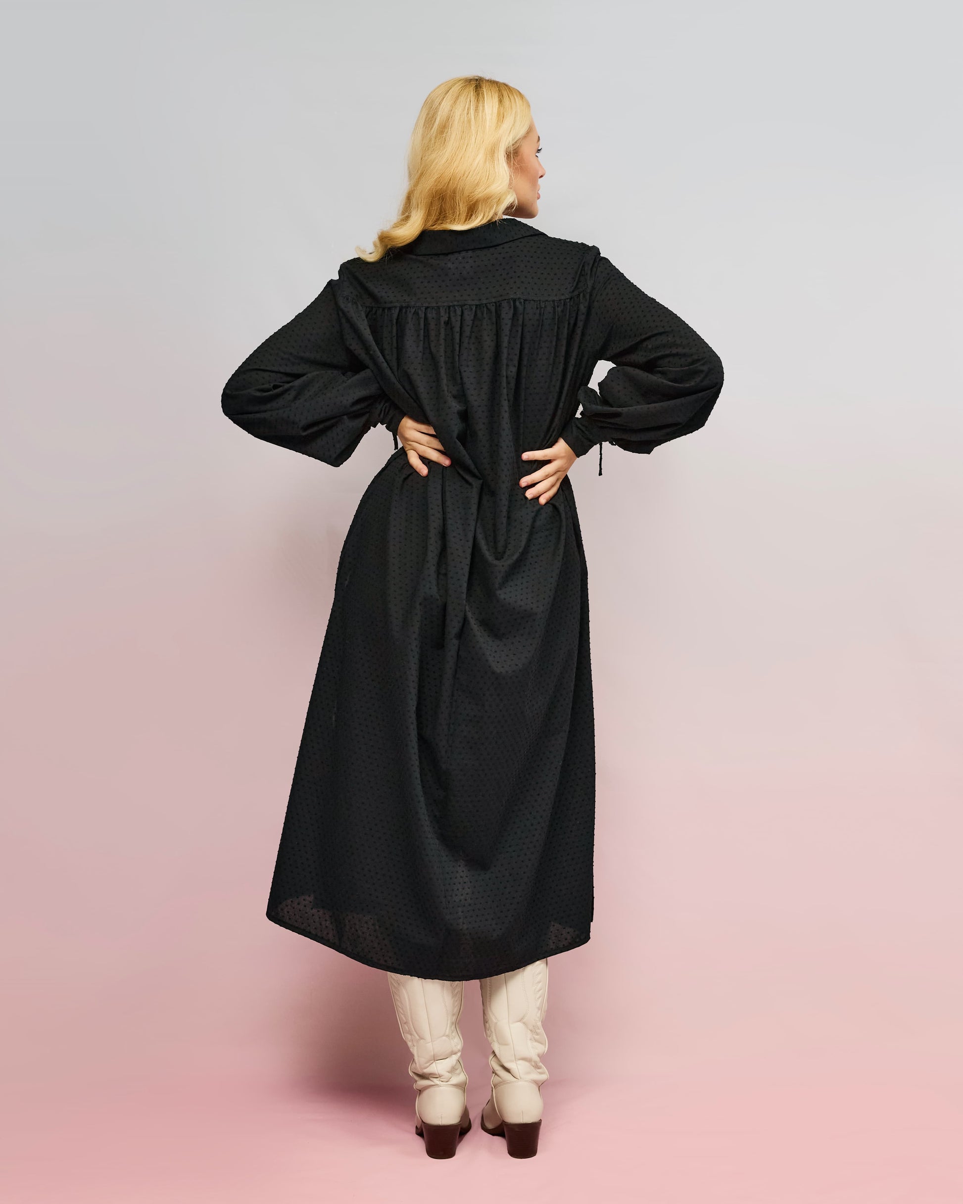Dieses schwarze, lange Hemdblusenkleid aus Baumwolle mit Schleifen ist nicht nur elegant, sondern auch äußerst bequem. Dank des lockeren Schnitts eignet es sich ideal zum Kombinieren – Sie können problemlos einen Rollkragenpullover oder andere wärmere Kleidung darunter tragen. Damit ist es die perfekte Wahl für kühlere Herbsttage. Es passt hervorragend zu Stiefeln und einem langen Mantel und ergibt so ein stilvolles und zugleich praktisches Outfit für jeden Anlass.