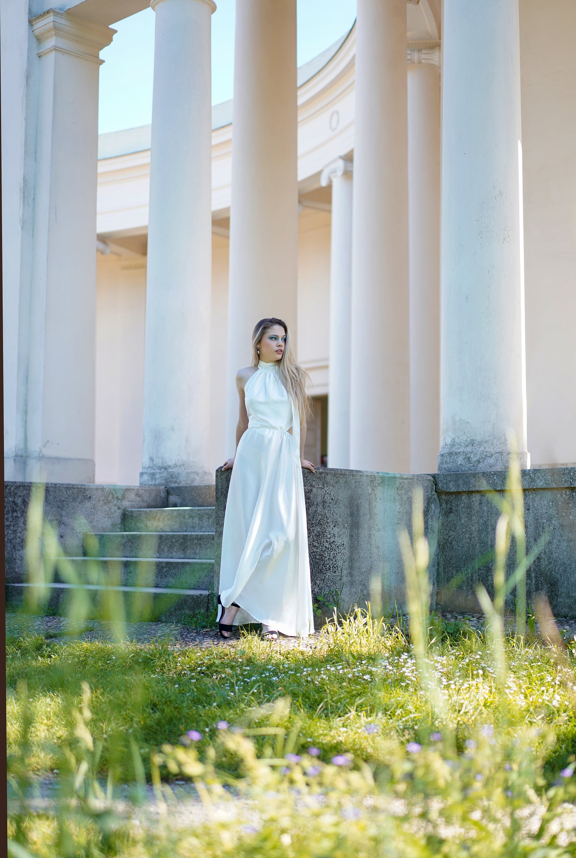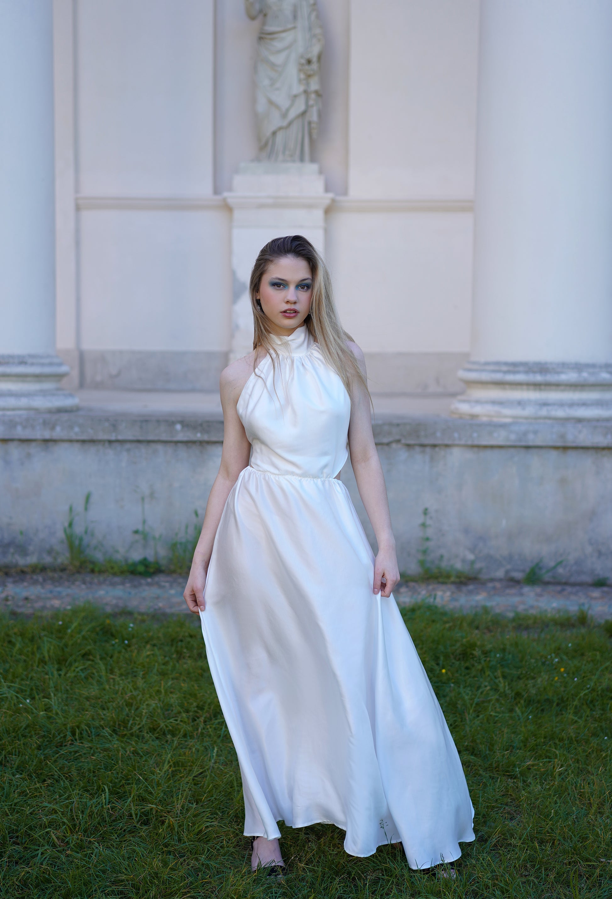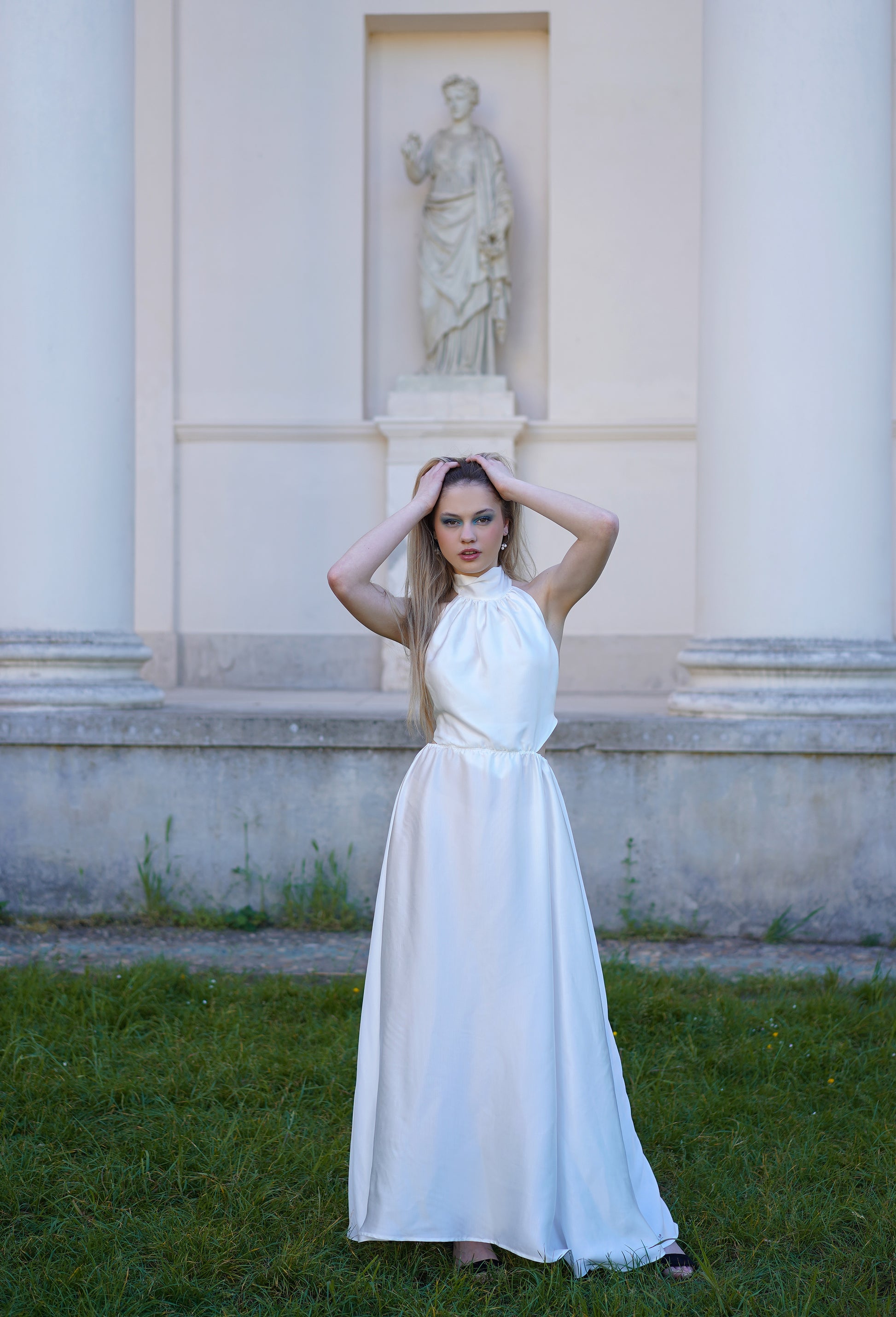 Saténové šaty z 80% hedvábí a 20% viskózy mají velmi elegantní a minimalistický vzhled. Látka má mírný lesk, je velmi splývavá a přes prsa má dvojitou vrstvu, takže je vrch neprůsvitný. Délku vám můžu upravit na míru a jsou tedy ideální volbou jako svatební šaty nebo i plesové šaty. V pase jsou na utahování na šňůrku, takže si velikost přizpůsobíte přímo na tělo. Za krkem se zavazují na mašli a mají holé záda. Přizpůsobí se krásně vaší postavě a můžete v nich pohodlně protančit večer.