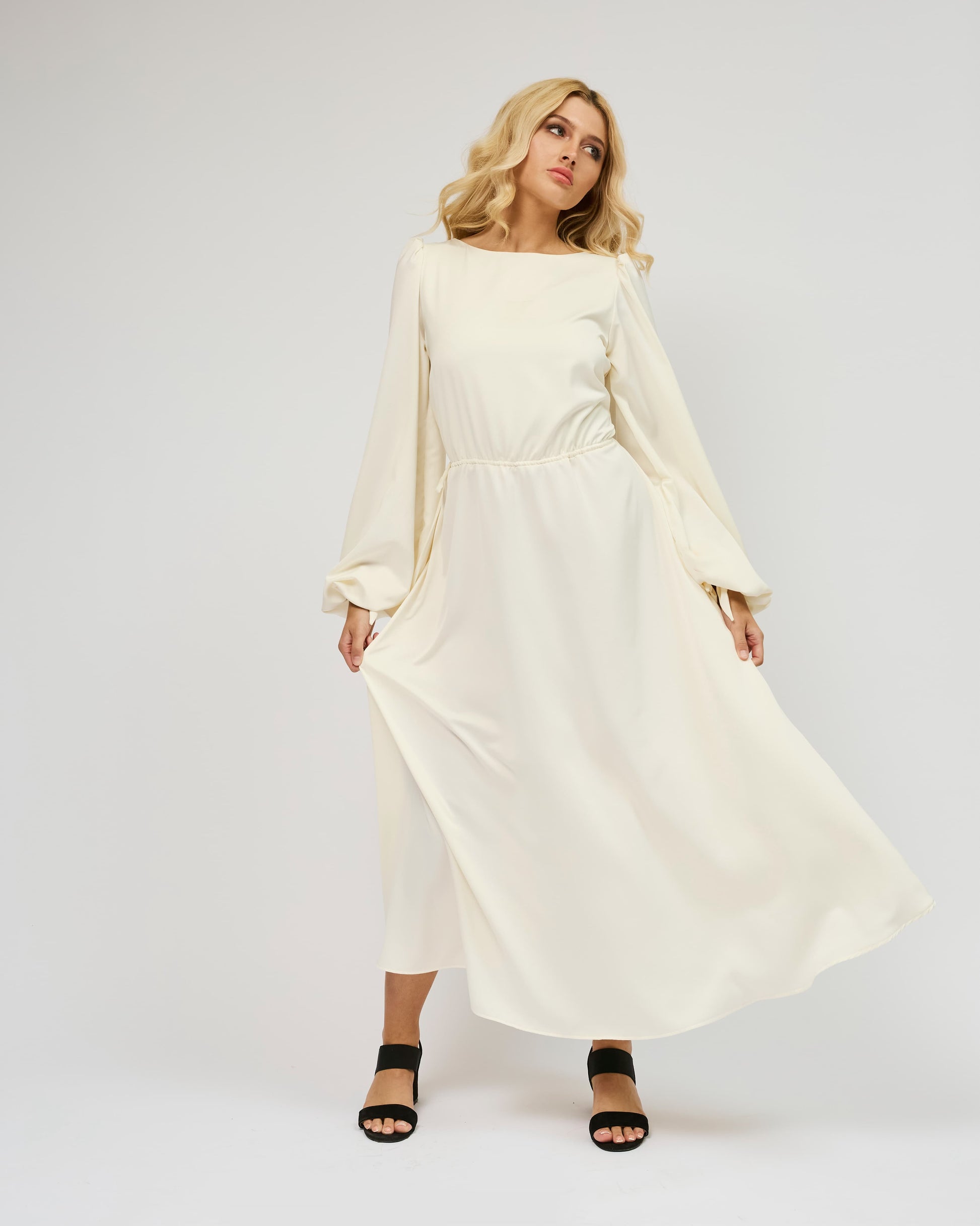 Saténové maxi šaty s dlouhým rukávem jsou ideální volbou pro každou příležitost, od slavnostních událostí po běžný den. S dlouhými mírně řasenými rukávy a áčkovou sukní vám dodají sofistikovaný vzhled, který oslní.