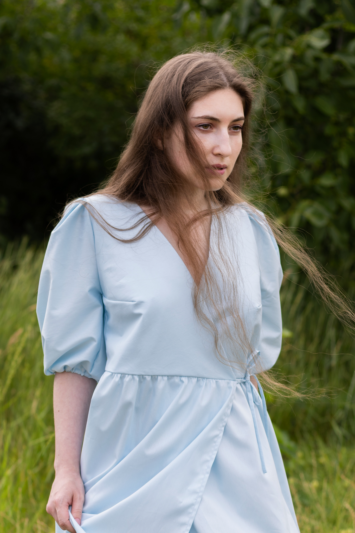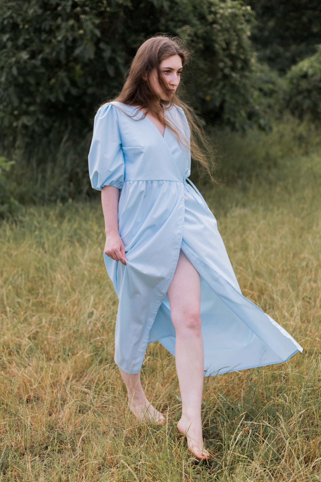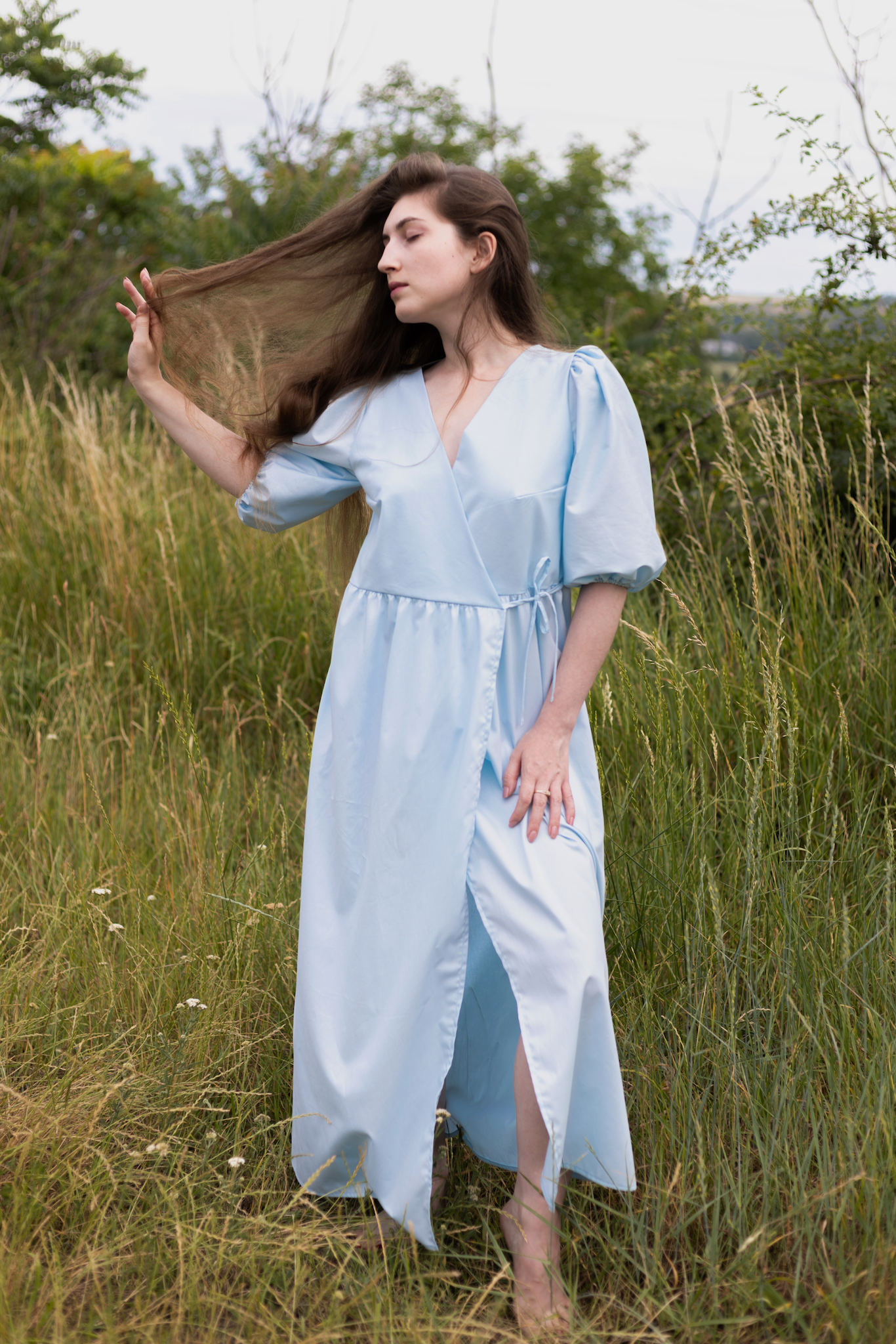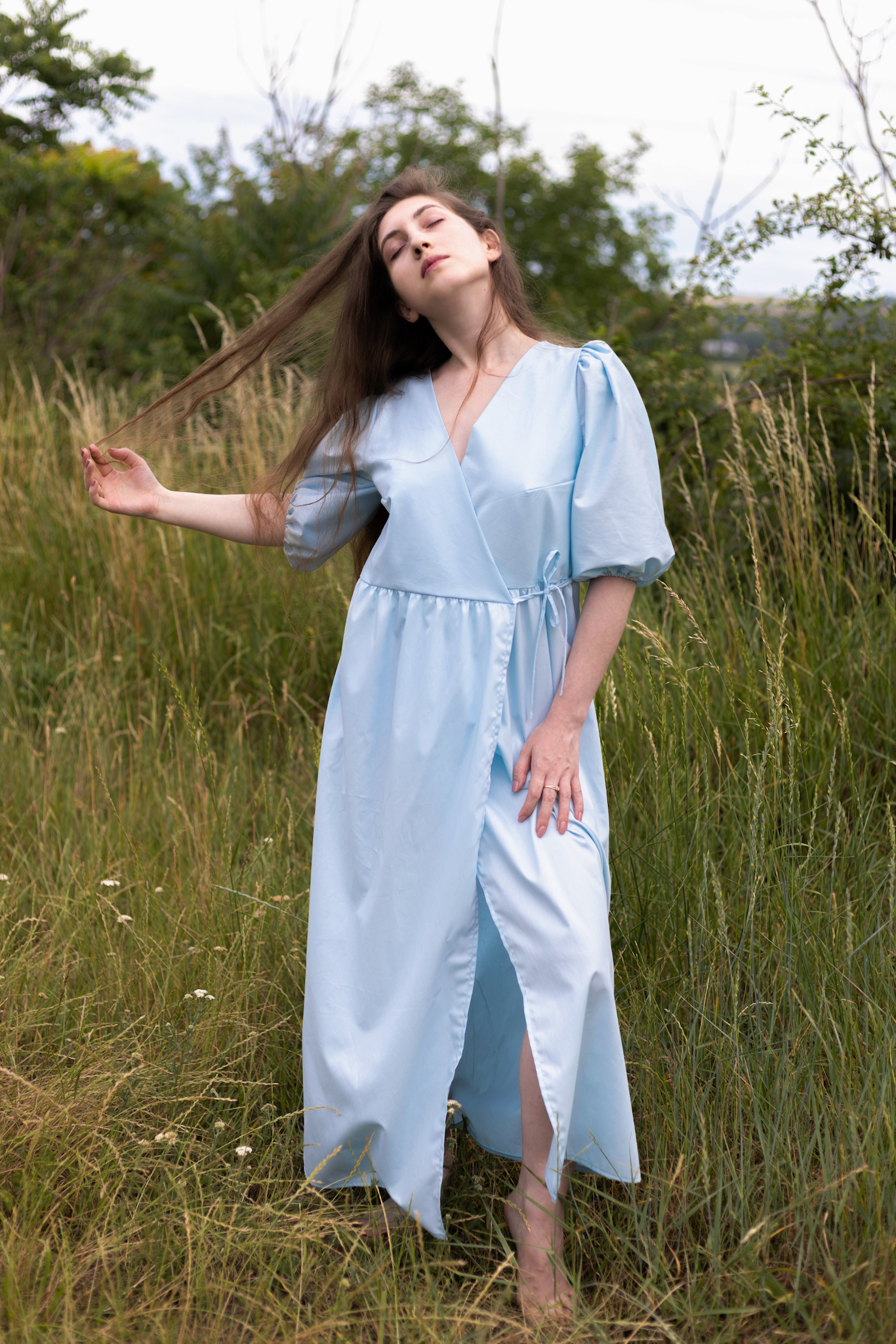 Lehké zavinovací světle modré šaty jsou ušité z organické bio bavlny. Látka je velmi lehká a prodyšná. Tyto šaty se hodí na jakoukoli postavu, protože je můžete nosit jak volnější, tak i utažené. V pase se zavazují na mašli na stranách a krátký rukávek je na gumičku. Krásně se pod šaty schová i podprsenka.