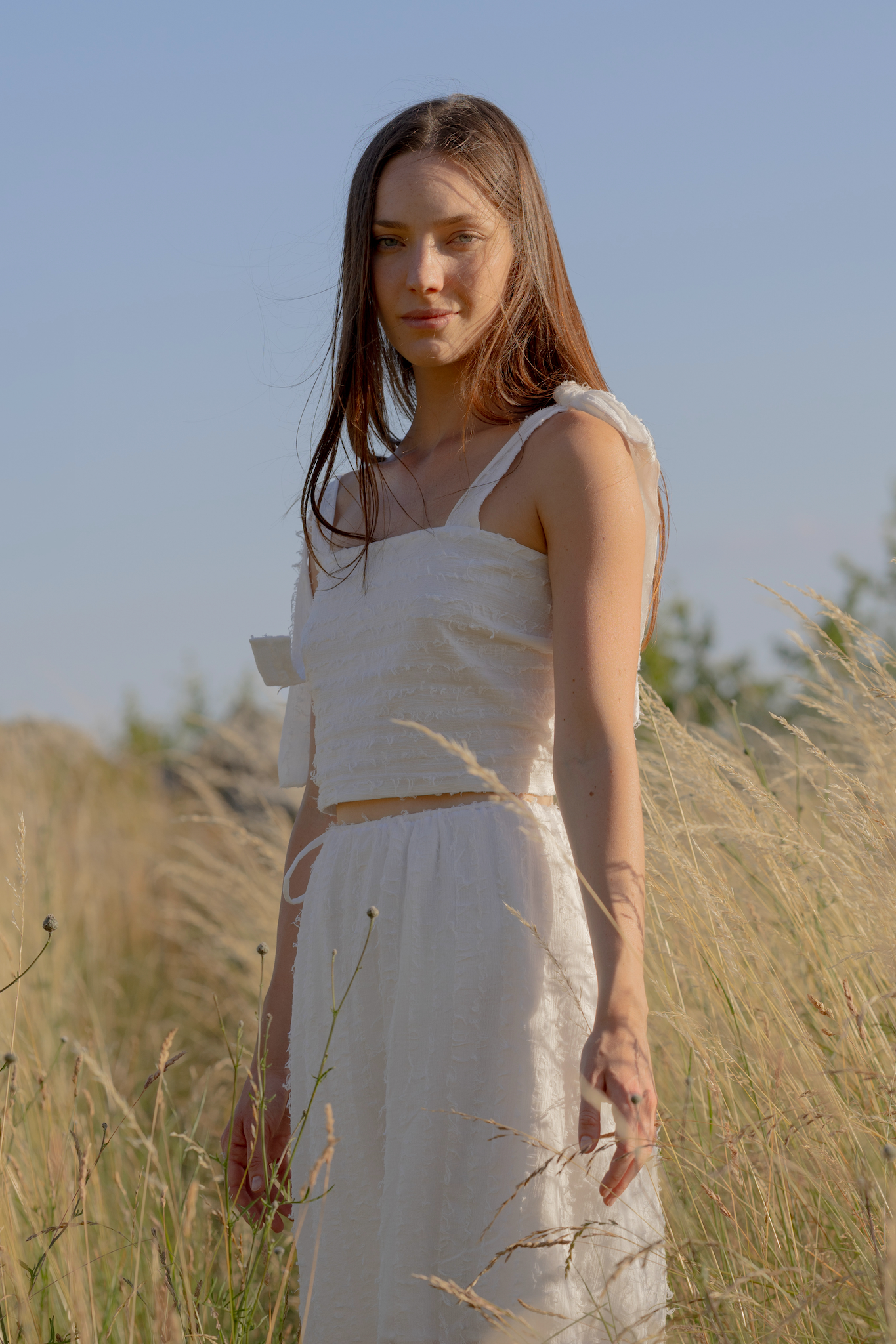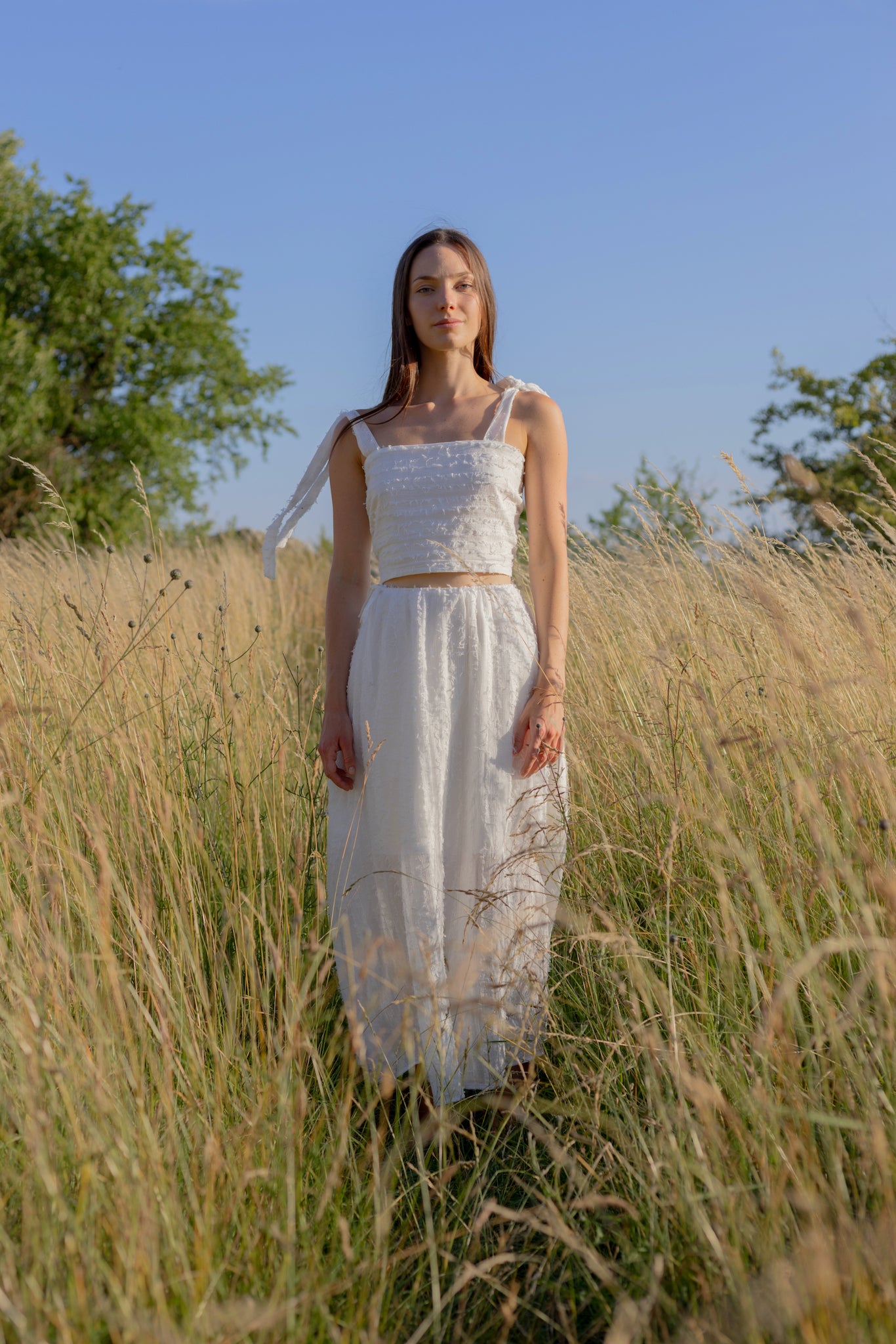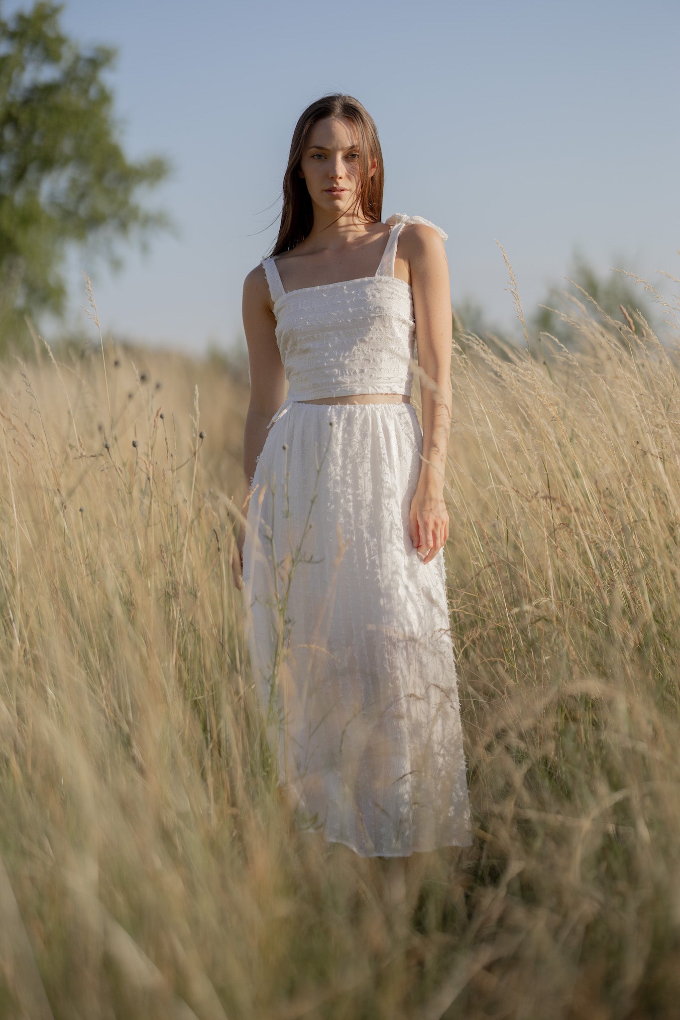 Dlouhá, lehce průsvitná sukně se stahuje na šňůrku v pase a doplňuje ji samostatná spodnička na gumičku pro pohodlí i decentní krytí. Celek působí étericky, ale je plně nositelný – ideální na letní slavnosti i procházky městem.