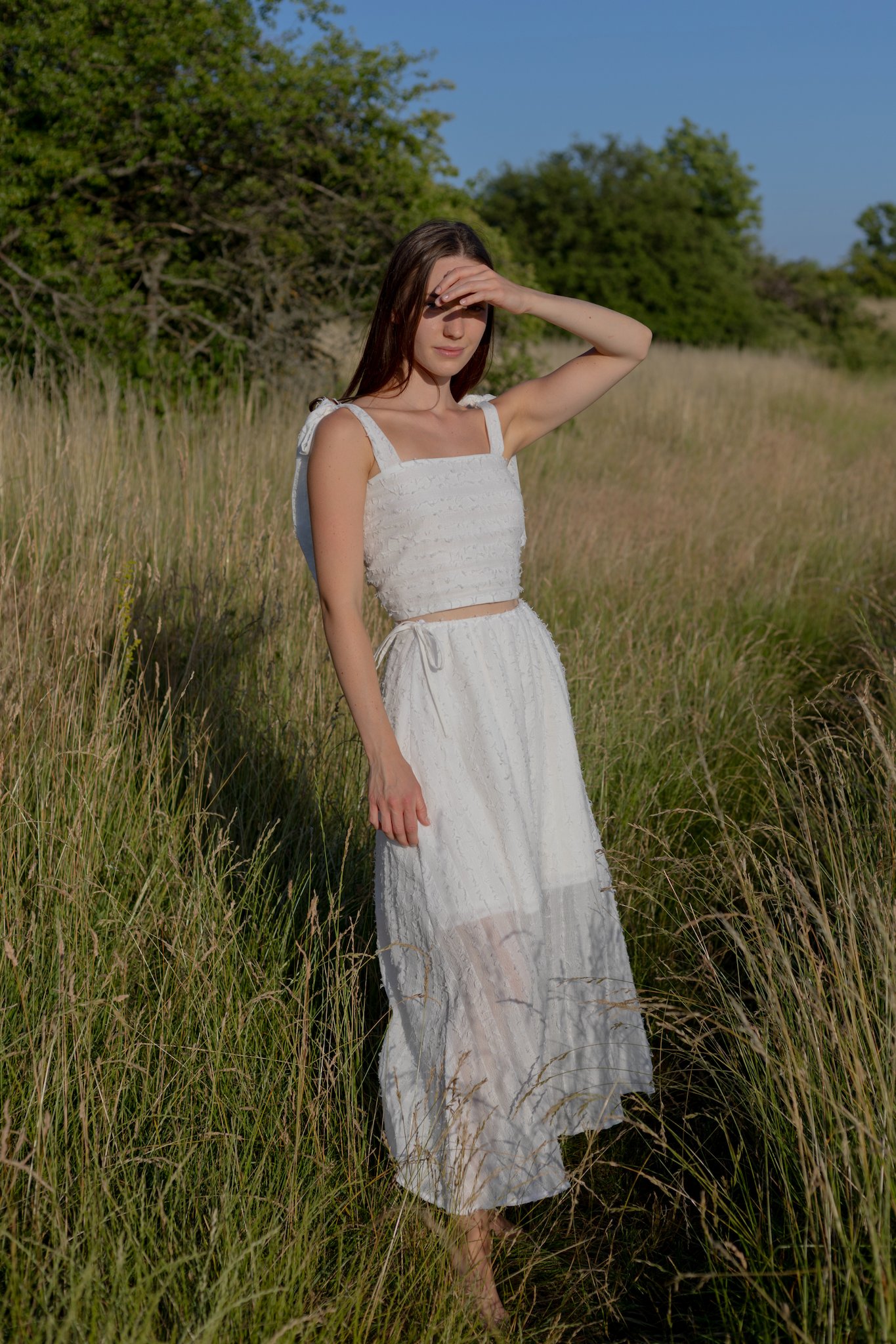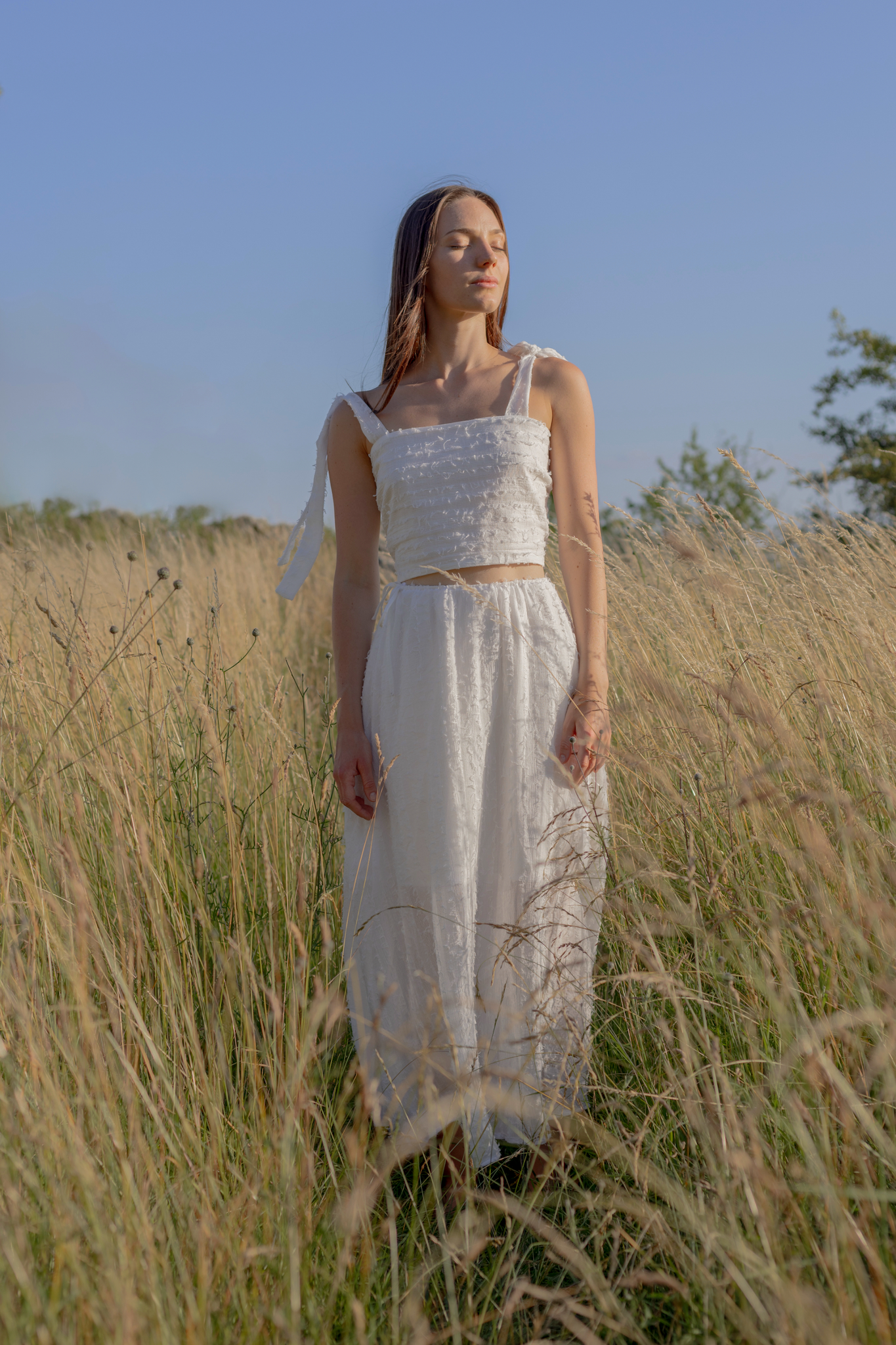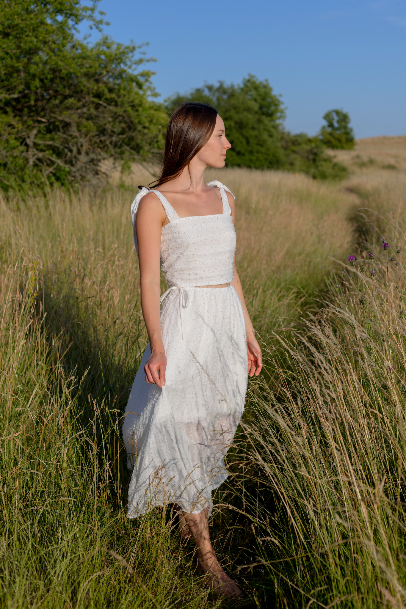 Dlouhá, lehce průsvitná sukně se stahuje na šňůrku v pase a doplňuje ji samostatná spodnička na gumičku pro pohodlí i decentní krytí. Celek působí étericky, ale je plně nositelný – ideální na letní slavnosti i procházky městem.