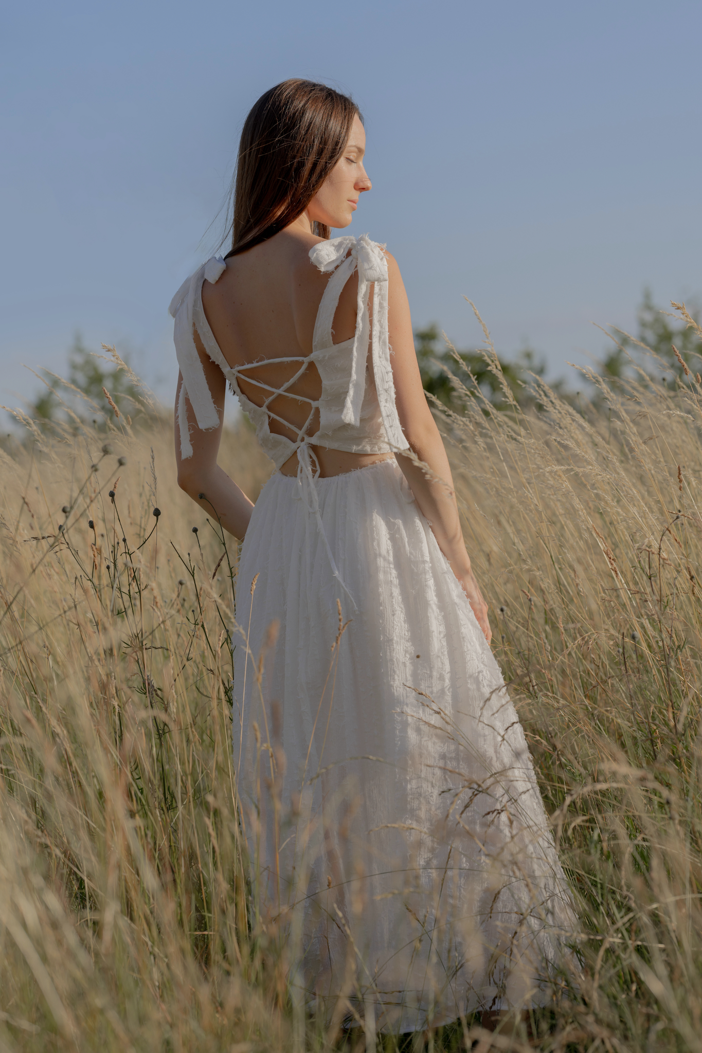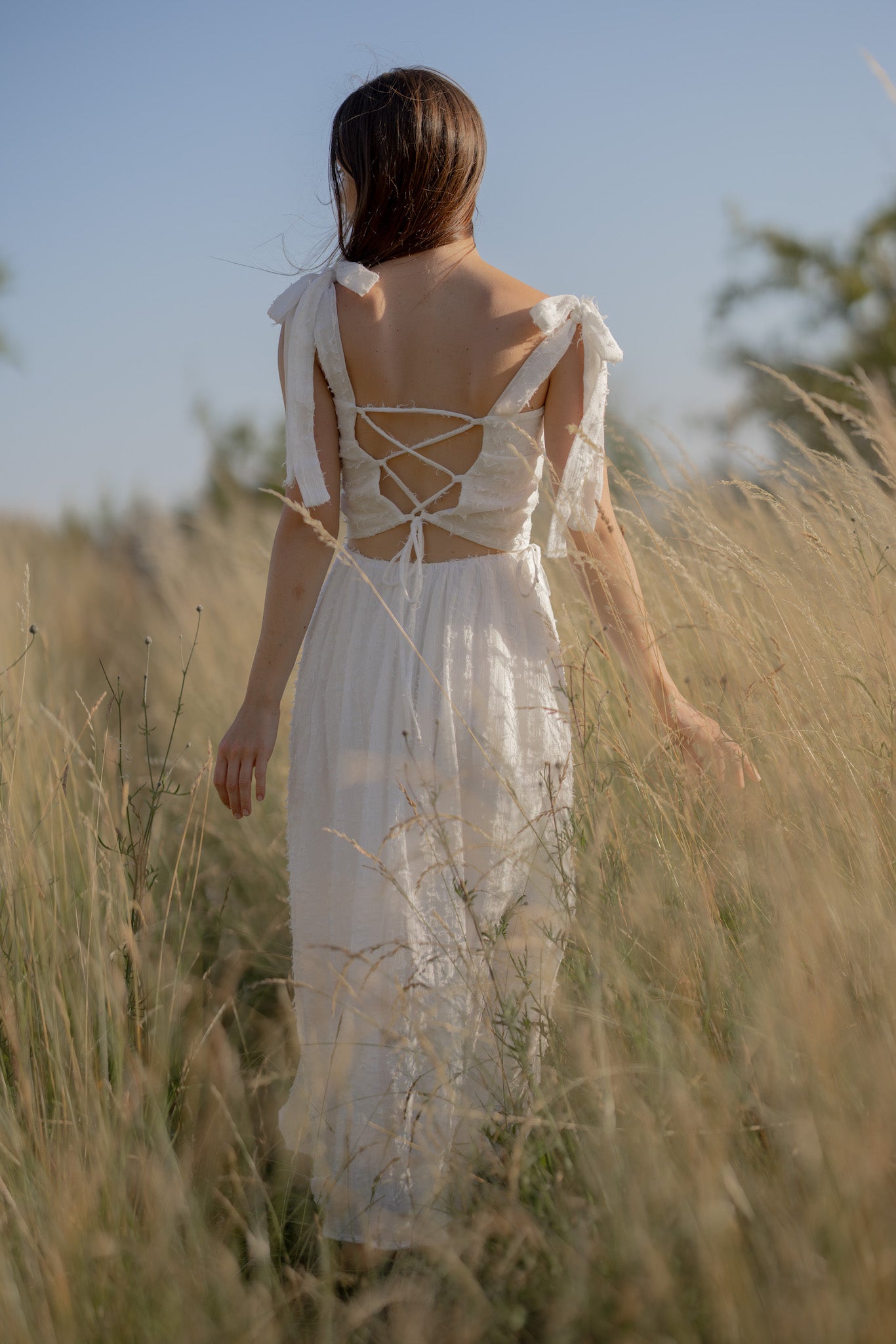 Lehký crop top ze vzdušné bavlny, podšitý jemným 100% lnem, je ideální na letní dny. Na zádech se šněrováním, které si upravíte přesně na svou postavu, a širokými ramínky zakončenými mašlemi, které dodávají romantický detail.