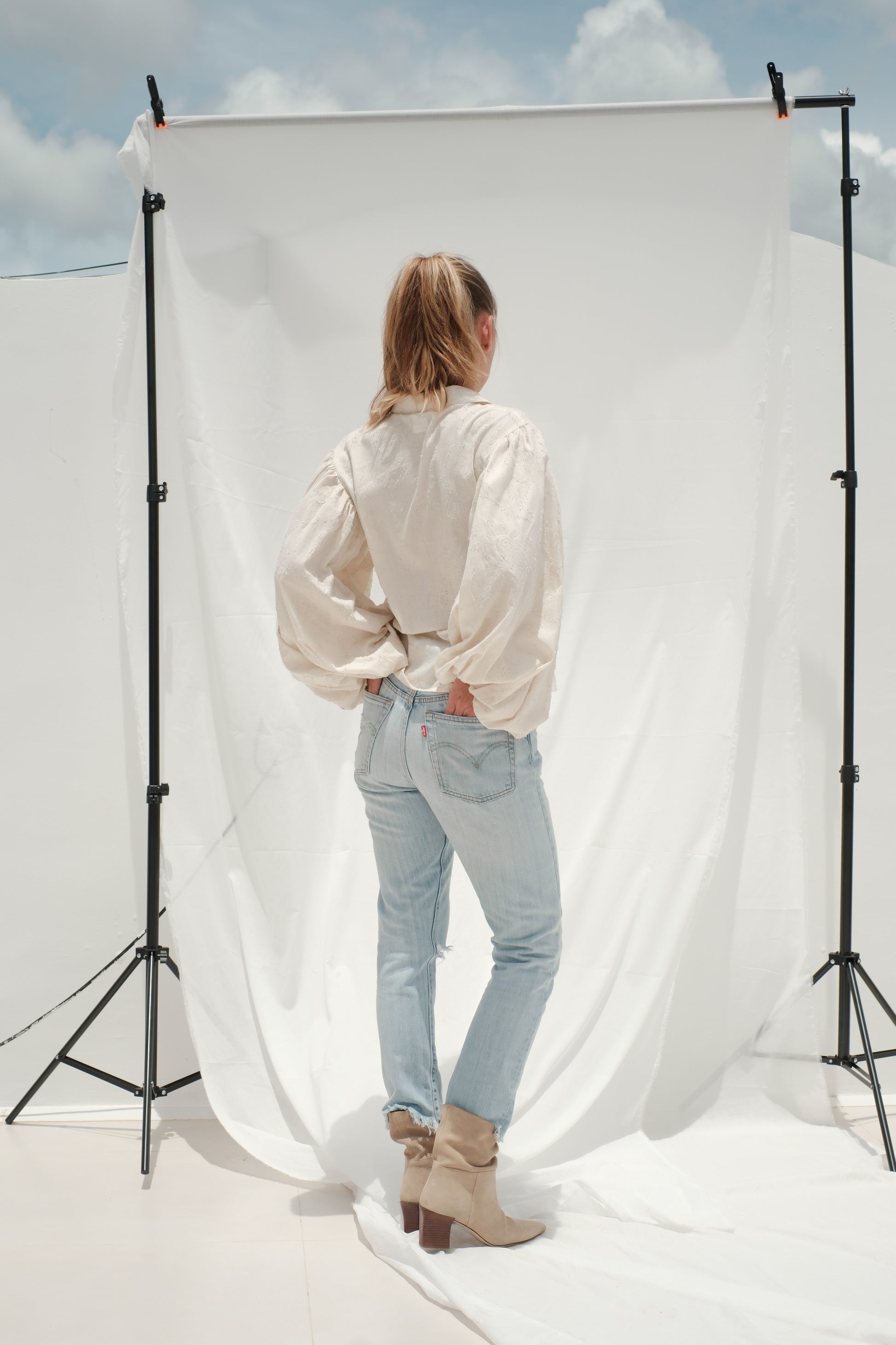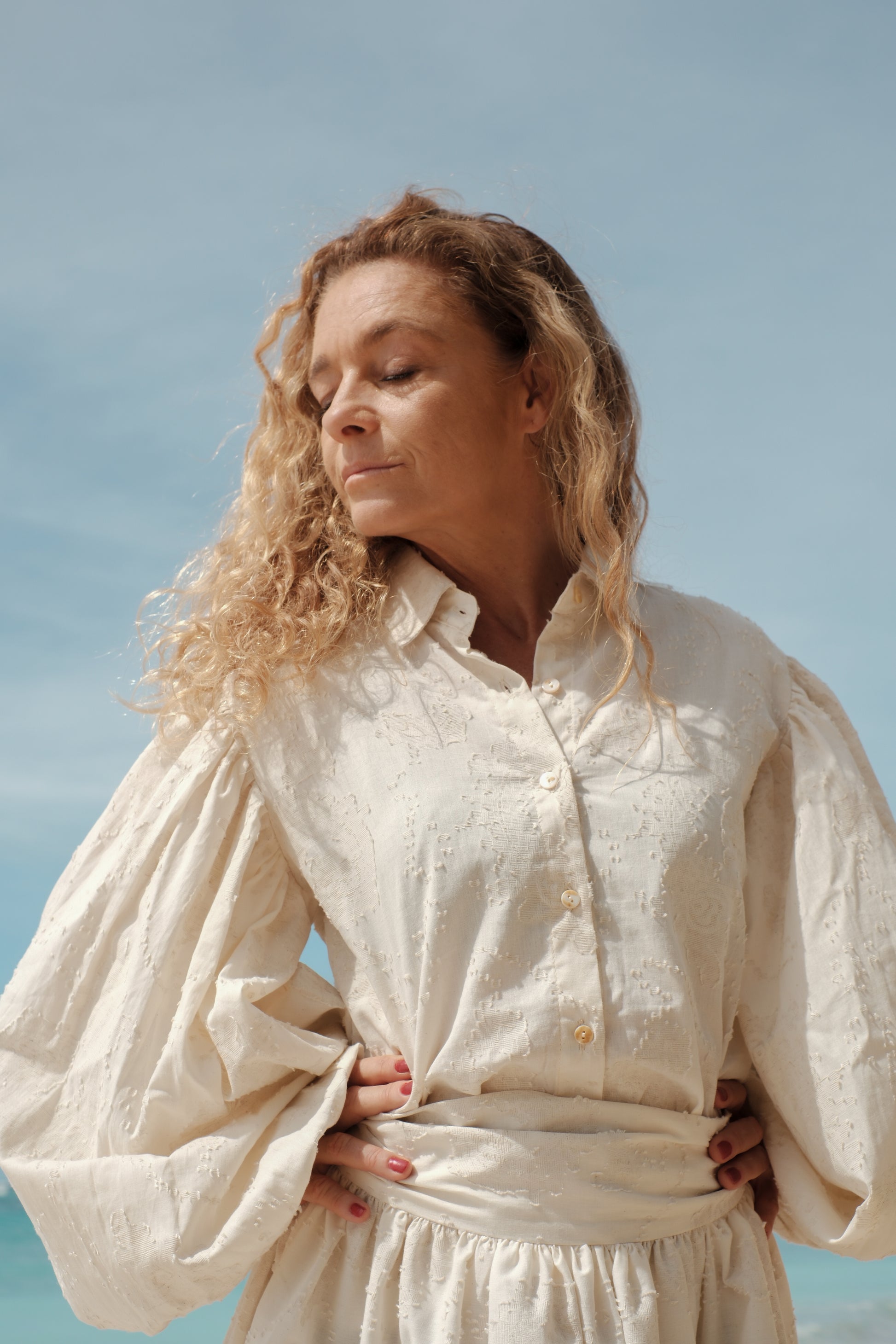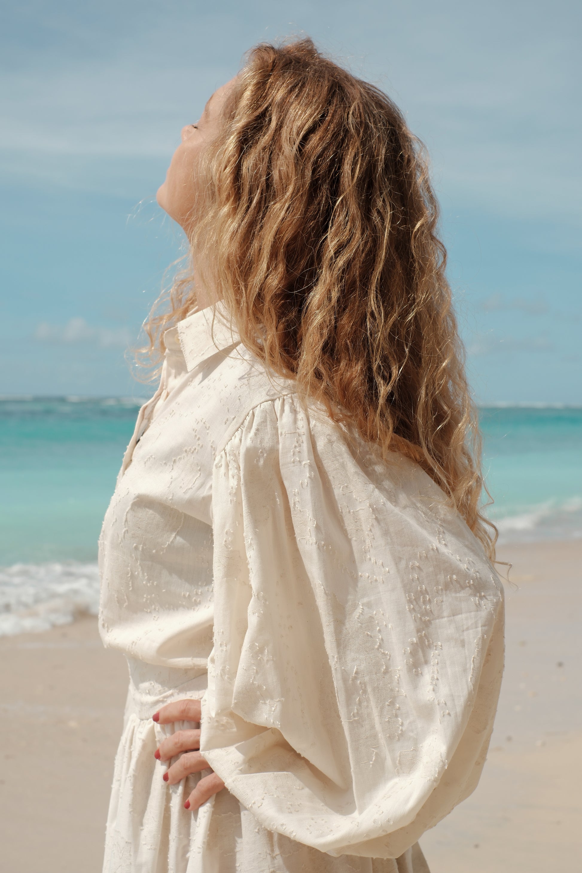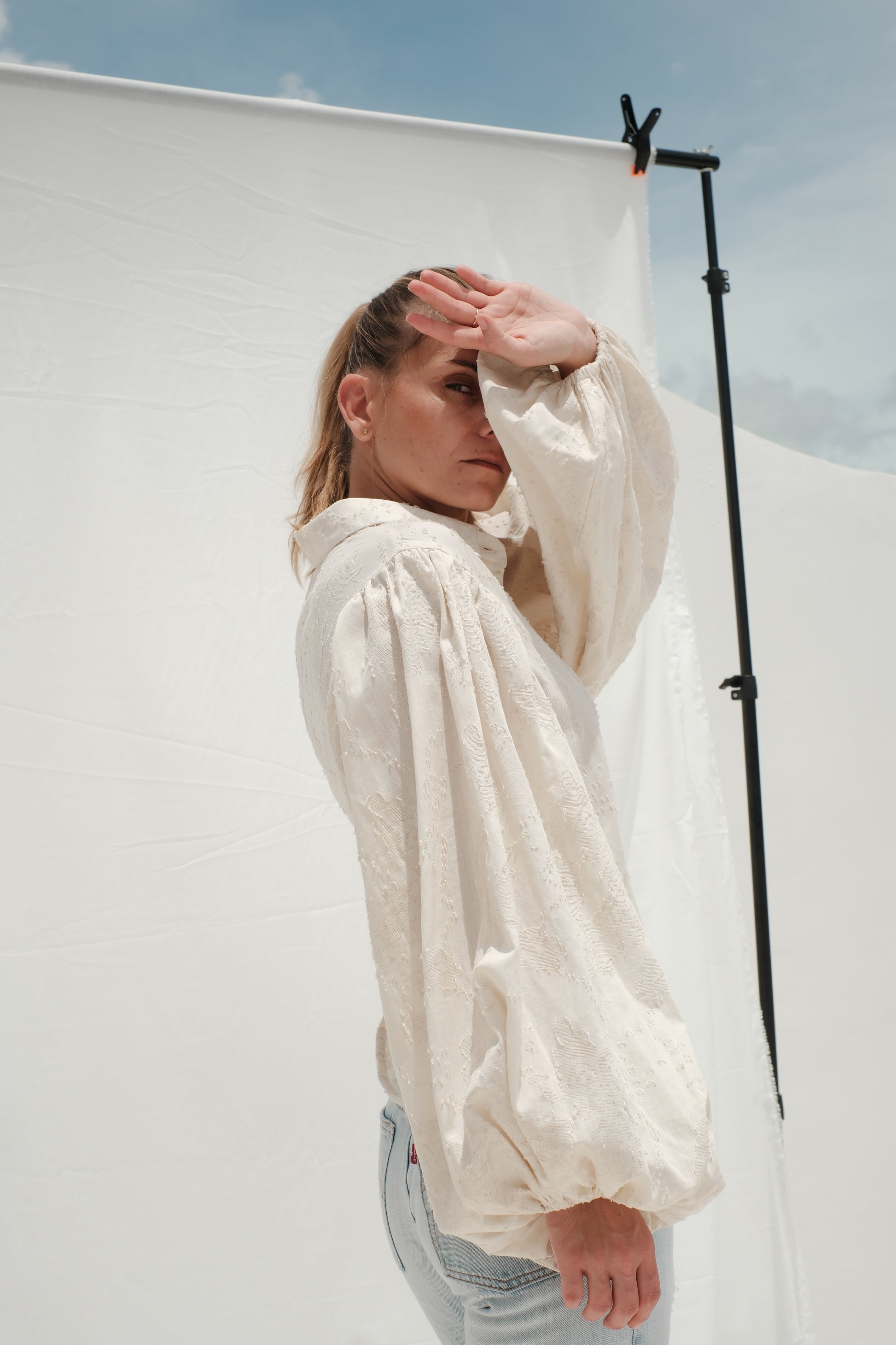 Dieses cremefarbene Jacquardhemd besteht aus einer hochwertigen Mischung aus 22 % Leinen, 18 % Viskose und 60 % Baumwolle . Es ist angenehm auf der Haut, atmungsaktiv und besticht dank der Jacquardstruktur durch einen luxuriösen und originellen Look. Die voluminösen Ballonärmel verleihen dem Hemd eine elegante Silhouette und machen es zu einem unverwechselbaren, aber dennoch sehr tragbaren Kleidungsstück.